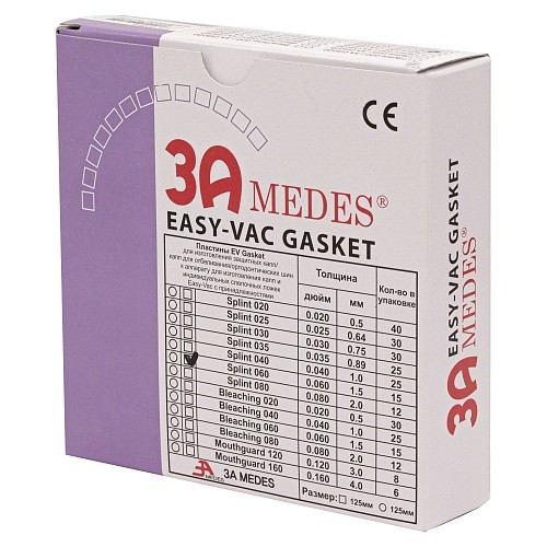 Пластины EV Gasket Bleaching 060 от бренда 3A MEDES толщиной в 1,5 мм – специализированный материал, применяемый для изготовления отбеливающих капп. Процесс осуществляется при помощи зуботехнического устройства – вакууматора.